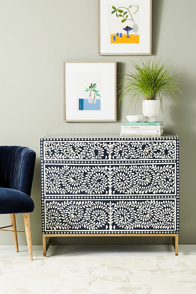 Tropical hardwood, engineered hardwood, and resin dresser with bone inlay detail Three drawers Drawers open on wood glides Due to the nature of hand-finished bone inlay, slight variation in the texture of this piece will occur Dust with a soft, clean cloth. Wipe gently with a warm, damp cloth; dry immediately. If liquid spills occur, prompt cleaning is advised. Avoid using chemical cleaners. Do not place hot items directly on surface Anti-tip hardware included for extra safety and stability This piece is intended for indoor use Base is removable No assembly required Imported